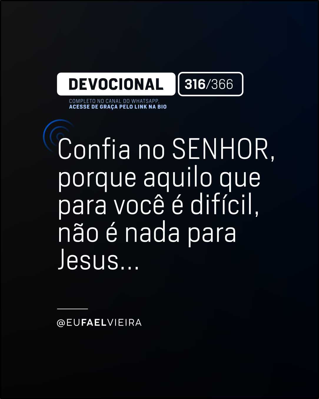 ⚠ Confia no SENHOR, porque aquilo que para você é difícil, não é nada para Jesus. Deite em segurança, descanse e confie que tudo irá terminar bem. Você pode enfrentar situações que o resultado não esteja conforme o que você deseja, contudo nestes tempos nebulosos a vontade dEle continua sendo perfeita.